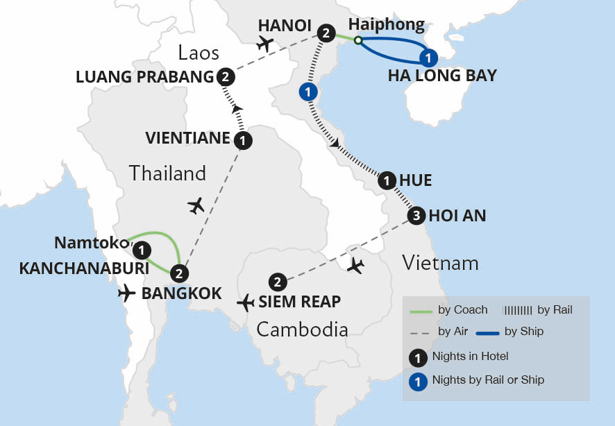 Join us for an amazing 19-day expedition through southeast Asia, exploring the wonders of Thailand, Laos, Vietnam and Cambodia. From Bangkok's gleaming golden temples and tranquil waterways, head into the Thai countryside to uncover the emotive past of the bridge on the River Kwai. Journey through Laos by modern train to mystical Luang...