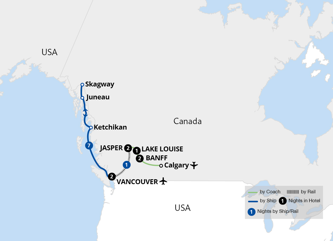 Experience the breathtaking beauty of Canada and Alaska on an unforgettable journey by land and sea. From the picturesque town of Banff, admire the beauty of Lake Louise and view the Athabasca Glacier before boarding the iconic Rocky Mountaineer, taking in breathtaking scenery on one of the world's most scenic railways as we journey to Vancouver.