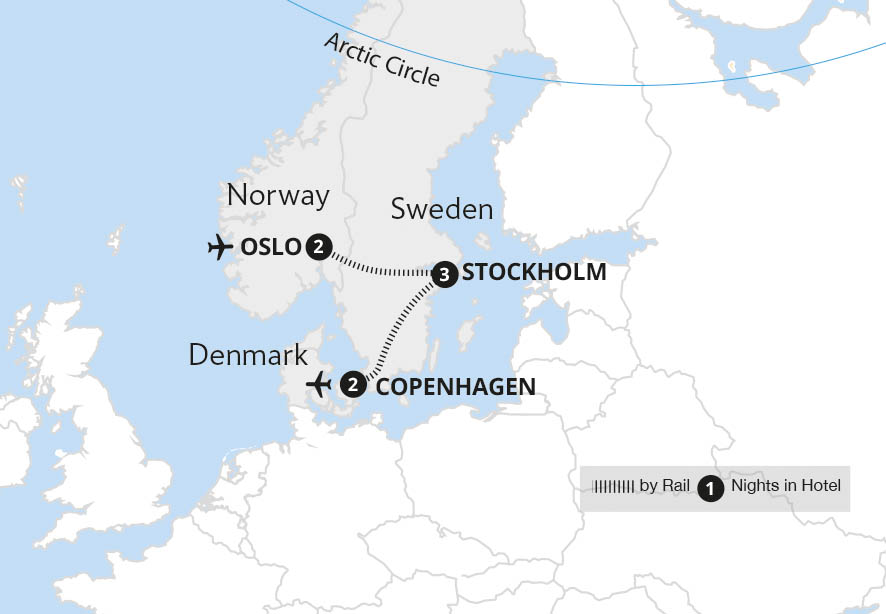 Discover evocative Scandinavian landscapes on picturesque rail journeys, between the cultured capitals of Norway, Sweden and Denmark. Starting in Oslo, uncover its stylish modernity and thousand-year history on a guided tour, before travelling by rail to majestic Stockholm. In the Swedish capital we visit the tiny Old Town, Gamla Stan, one...