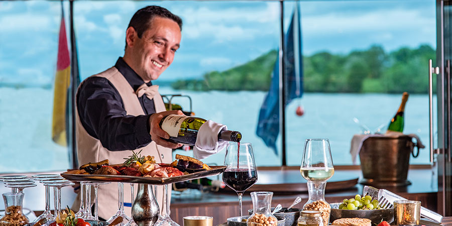 The ship's onboard restaurant offers the finest local and international cuisine. Breakfast and lunch are indulgent buffets while every evening is a special occasion, as our chef introduces specialities and regional dishes. A vegetarian option is offered for all meals. Complimentary coffee and tea are available all day, and a selection of branded soft drinks, regional wine and house draft beer is included with dinner. On the final or penultimate night of our cruise, we enjoy a special Gala Dinner.