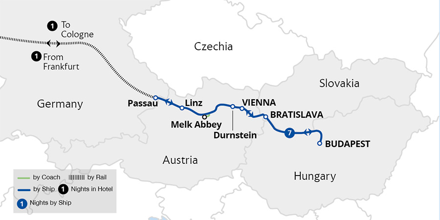 Sail from the German town of Passau through the Austrian wine-growing region of the Wachau Valley, admiring picturesque Dürnstein and Melk Abbey enroute. After exploring imperial Vienna, the captivating Hungarian capital of Budapest and the Baroque Old Town of Bratislava, you visit Linz before returning to Passau.
