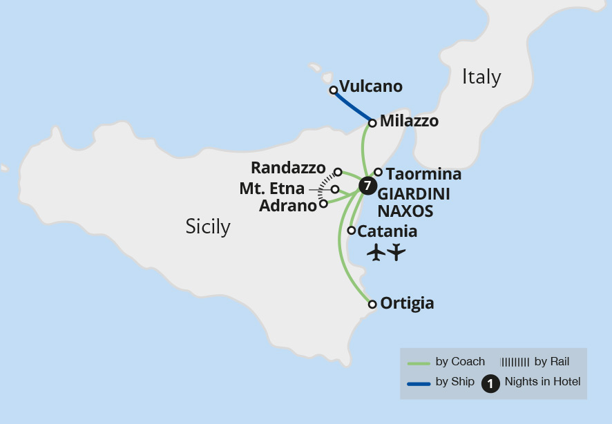 Fly to and from Catania to uncover the charms of Sicily from bases in cosmopolitan Palermo and the laid-back coastal resort of Giardini Naxos. Discover the historic towns of Monreale and Syracuse, whose architecture showcases the history and cultural influences of Sicily. Explore the Valley of the Temples and Taormina's Greek theatre. ...