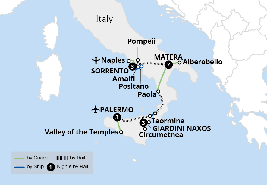 Delve into the diverse culture of Southern Italy and glorious Sicily, immersing yourself in its rich history, landscapes, and idyllic coastlines, and indulging in local cuisine. Each stop reveals layers of history, beauty, and local charm - from the unique houses of Matera and Alberobello to Sicily's magnificent Greek temples, the Palatine...